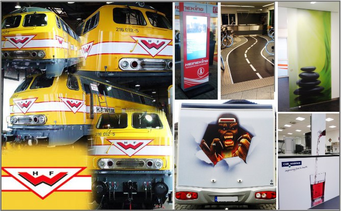 ![]() | Wie gesagt: "Wir beschriften (fast) alles! Solange die zu beklebende Oberfläche geeignet ist, lässt sich nahezu alles beschriften. Bilder: Diesellok mit Streifen und Logo, Mediascreen und Wohnmobil mit Digitaldruck, Fußboden mit Folie und Antirutschlaminat, Glastüren und Schränke. |