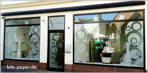 | Schaufensterbeschriftungen mit Glasdekormuster-Folie und lichtdurchlässigem Digitaldruck. |